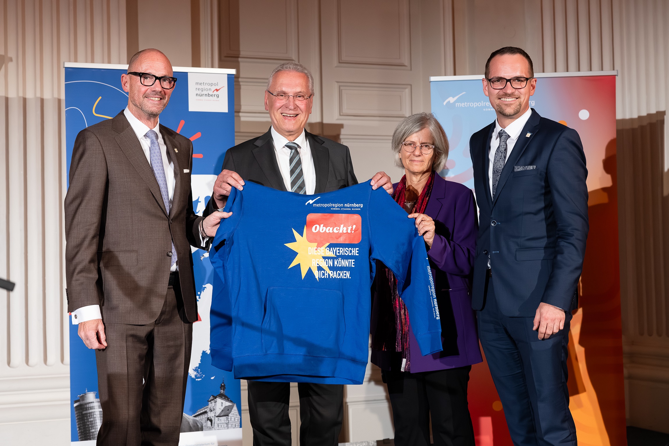 Zum Abschluss gab es ein symbolisches Geschenk für Innenminister Joachim Herrmann, einen blauen Hoodie mit der Aufschrift „Obacht! Diese bayerische Region könnte dich packen“. Mit dem Mitbringsel verbunden war der Wunsch nach regelmäßigen Gesprächen mit der Bayerischen Staatskanzlei und der Wille, gemeinsam anzupacken.