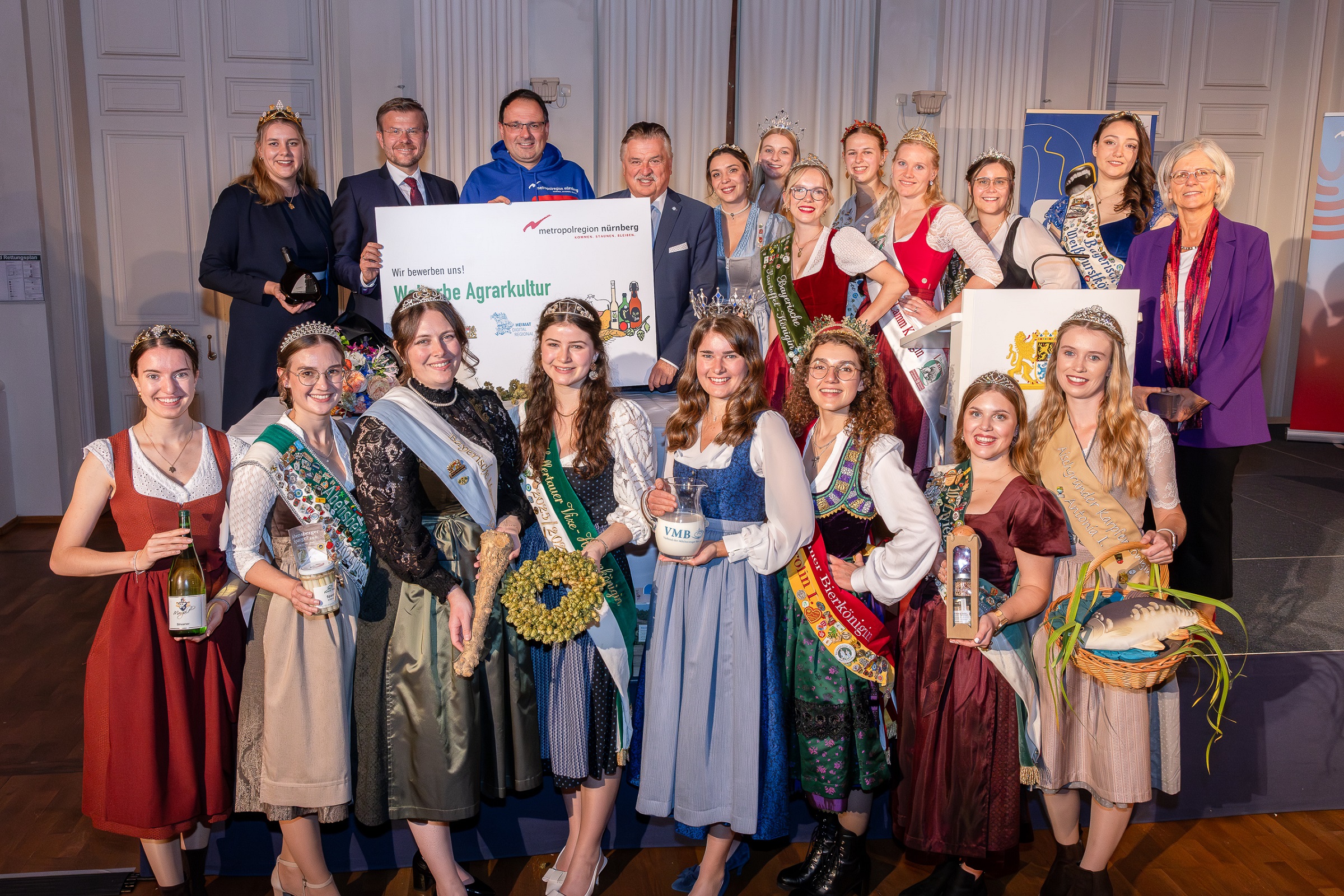 Exemplarisch vor Augen führten dies 19 Produkthoheiten, von der Altmühltaler Lammkönigin über die bayerische Bierkönigin bis zur Holzfee. Sie zeigten mit ihrer Fülle an regionalen Genüssen und Waren, was ihre Heimat ausmacht: Produkte höchster Güte, die in einer intakten, kleinteiligen Landwirtschaft und einer traditionsreichen Kulturlandschaft wachsen und für eine nachhaltige Ernährung sorgen. Mit diesem Schatz bewirbt sich die Metropolregion Nürnberg als erste Region Deutschlands um den Titel Welterbe Agrarkultur.