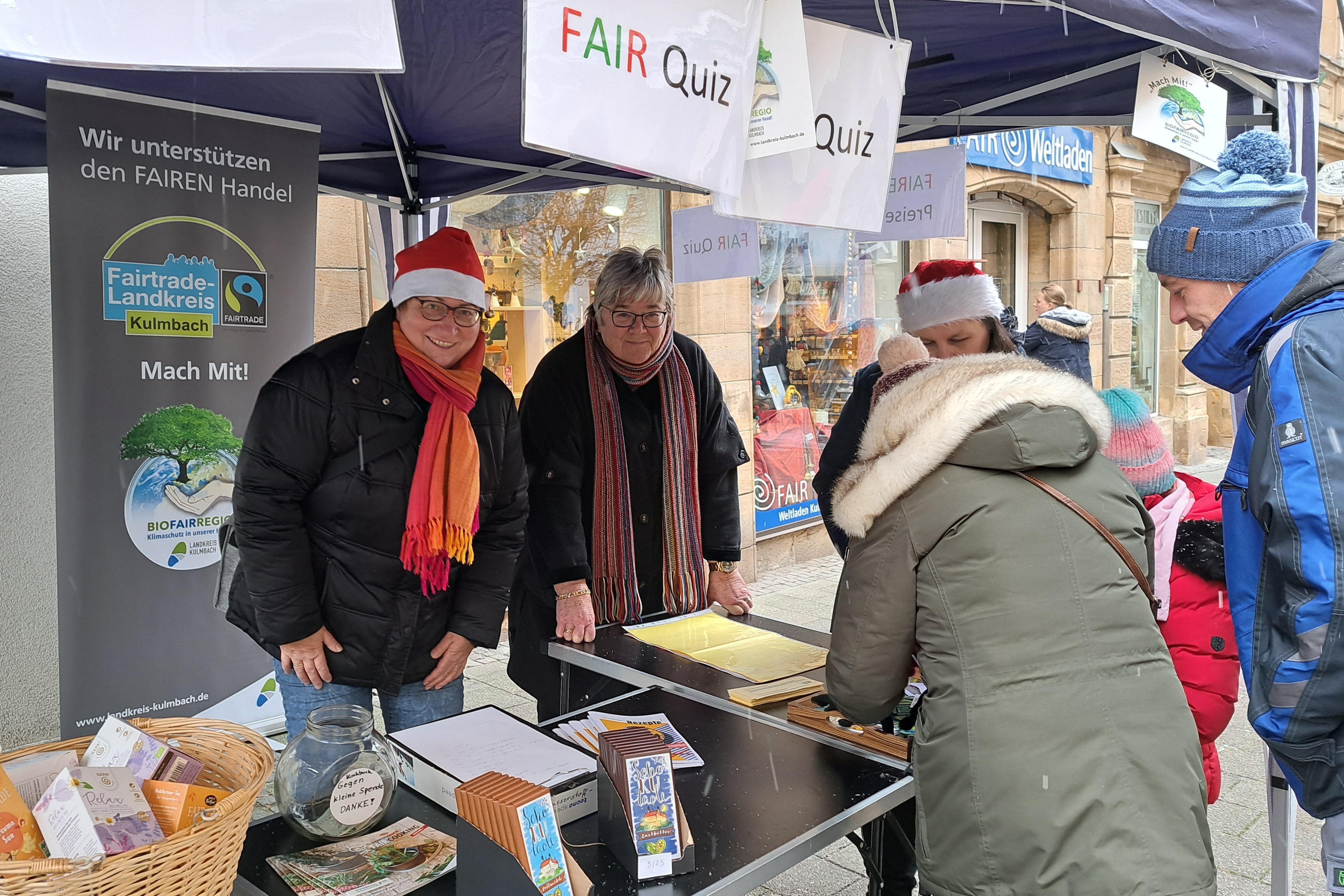 Die Steuerungsgruppe des FAIRTRADE-Landkreises Kulmbach freut sich auf Ihren Besuch am 7. Dezember 2024 ab 11.00 Uhr vor dem Weltladen in der Fußgängerzone.
