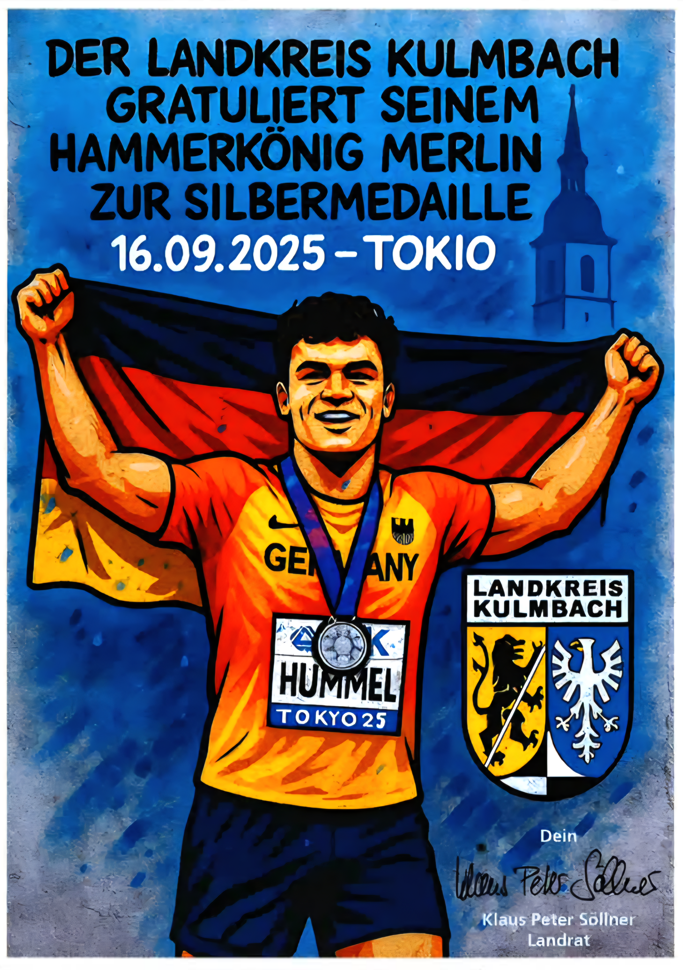 Mit seiner neuen Bestweite von 82,77 Metern und der Silbermedaille bei den Weltmeisterschaften hat Merlin sicher ein Stück Sportgeschichte geschrieben – für Kulmbach, für Oberfranken und für Deutschland.