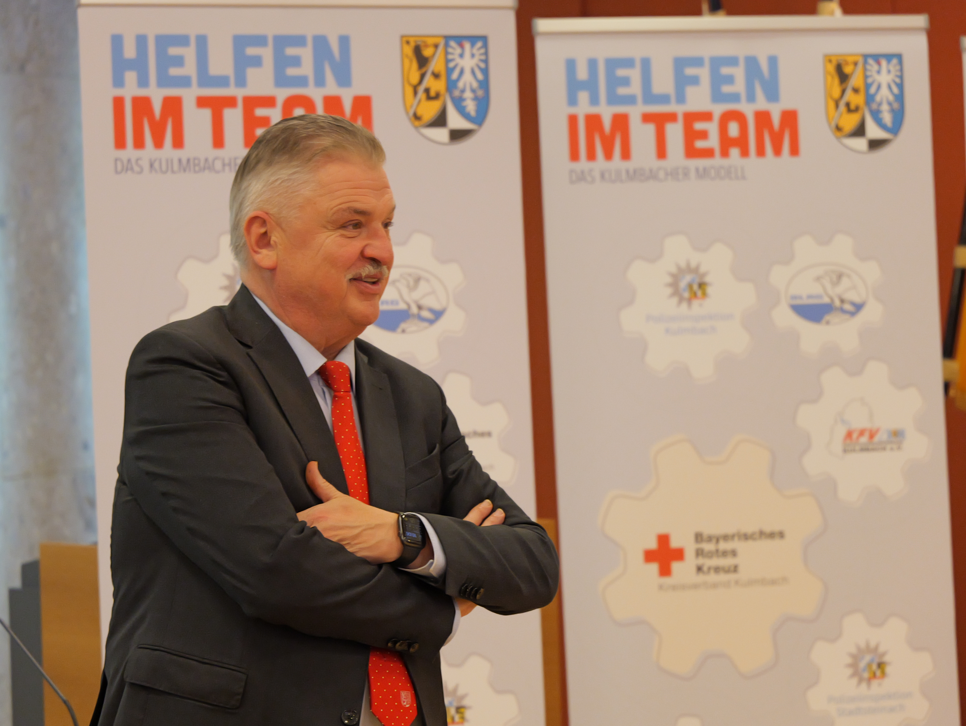 Landrat Klaus Peter Söllner als höchster Vertreter im Katastrophenschutz im Landkreis Kulmbach ist stolz auf „seine“ Blaulichtfamilie. Von der Polizei über die Feuerwehr, das THW und das BRK mit seinen Gliederungen bis zu DLRG und den Maltesern arbeiten alle Blaulichtorganisationen eng zusammen – ohne jedes Kompetenzgerangel, einfach nur, um zu helfen, wo sie gebraucht werden und das bestmöglicher Ergebnis zu erzielen. Das „Kulmbacher Modell“ hat Aufsehen erregt über die Region hinaus. Jetzt wird darauf in besonderer Weise aufmerksam gemacht: Der Kreisfeuerwehrverband Kulmbach übergab Roll-Up`s an die Polizeiinspektionen und die Hilfsorganisationen im Landkreis Kulmbach und lässt damit das sogenannte „Kulmbacher Modell“ grafisch neu aufleben, damit man es auch sehen und nicht nur in Notsituationen unmittelbar spüren kann.