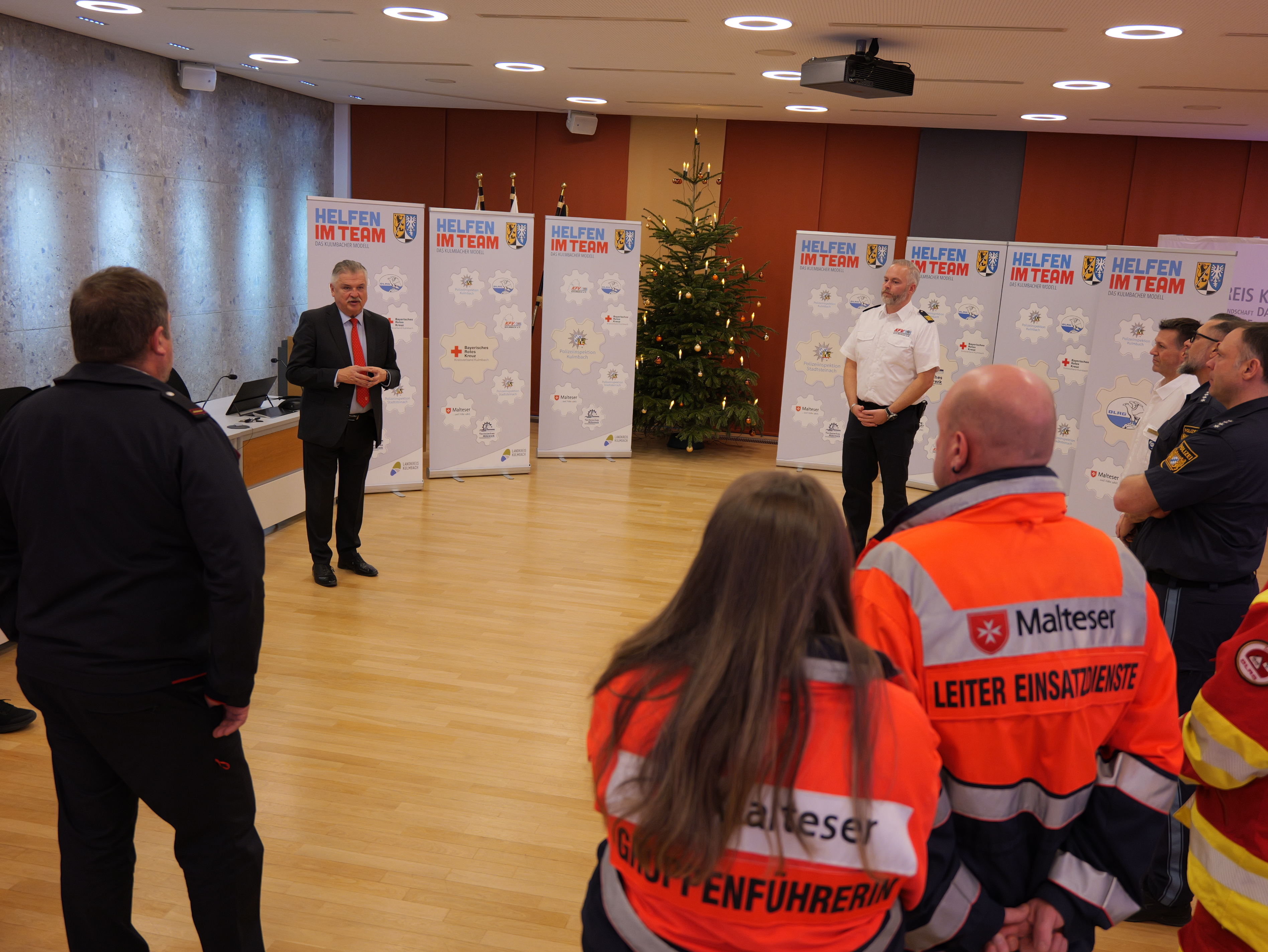 „Was wir da im Landkreis Kulmbach haben, ist beispielgebend“, betont Landrat Söllner. Über viele Jahre habe sich das „Kulmbacher Modell“ entwickelt. „Das Besondere bei uns ist, das alle Organisationen von der Polizei bis BRK, DLRG, den Maltesern, der Feuerwehr und dem THW alle ohne Wenn und Aber an einem Strang ziehen.“ Andernorts gebe es durchaus immer mal wieder unterschiedliche Auffassungen zwischen den einzelnen Hilfsorganisationen. Auch über Kompetenzen werde schob mal diskutiert. „Bei uns herrscht seit Jahren eine hervorragende Zusammenarbeit, die von den Organisationen gelebt wird.“ Das werde in Katastrophenfällen oder bei sonstigen Großeinsätzen besonders deutlich.