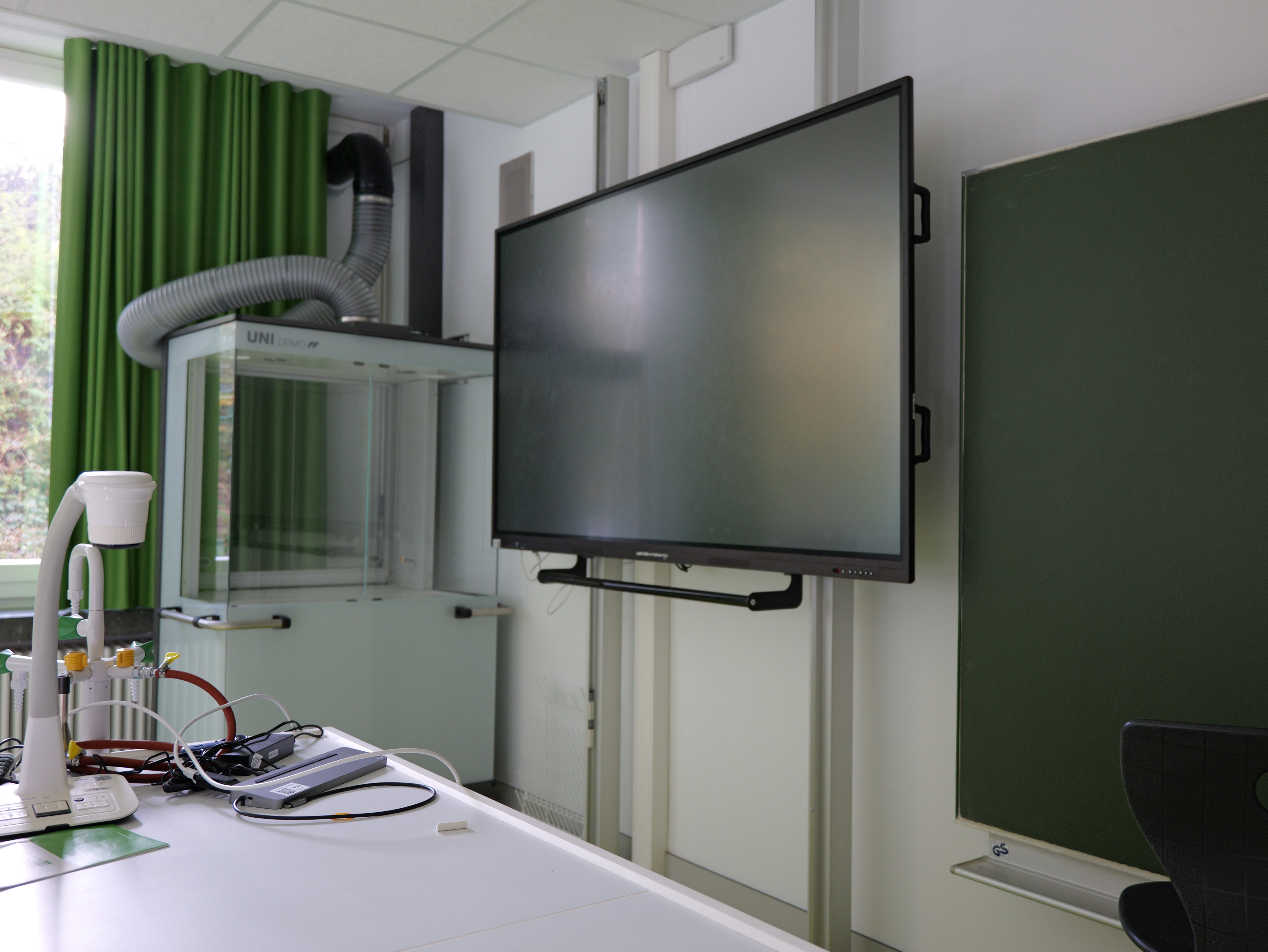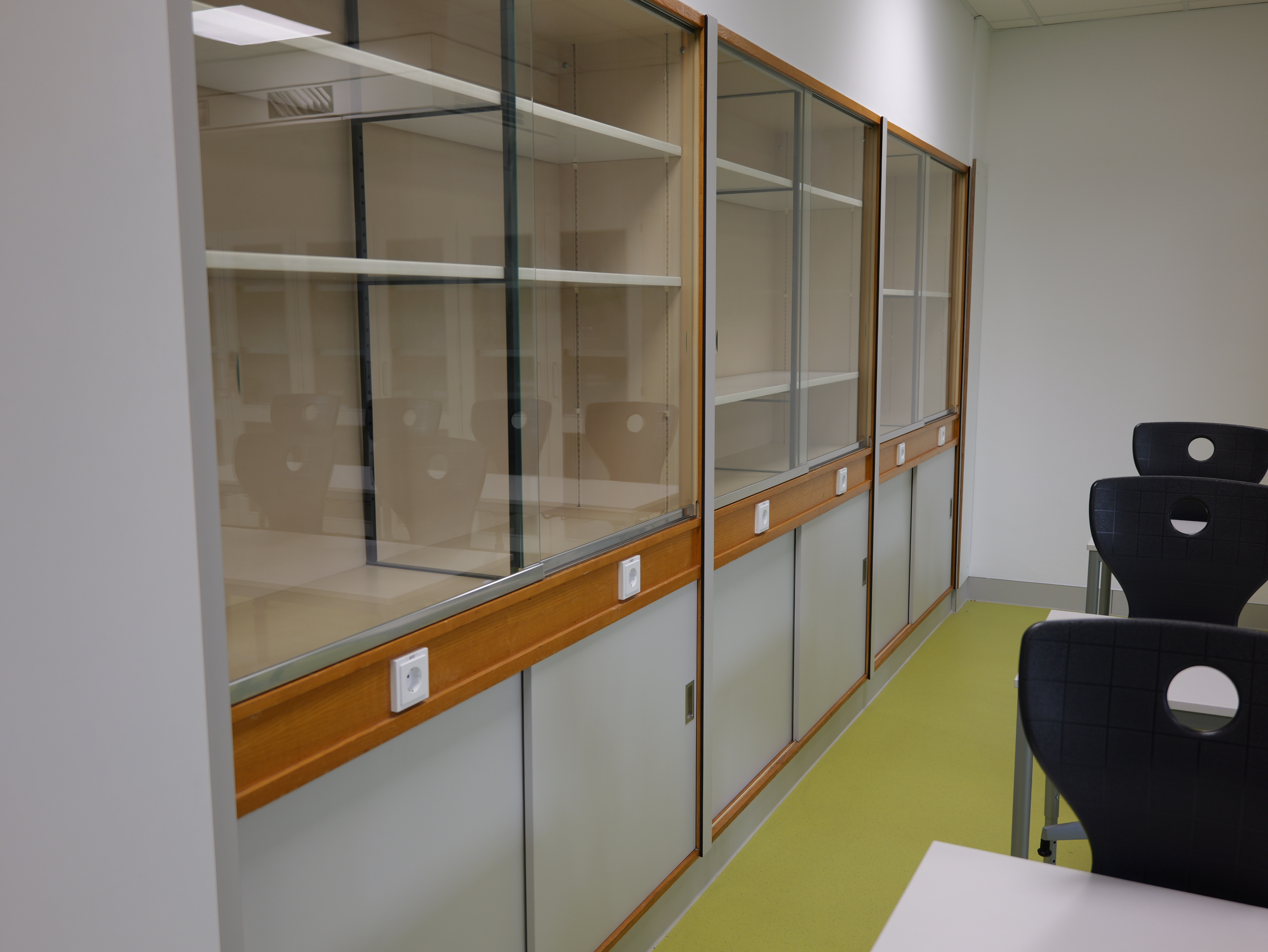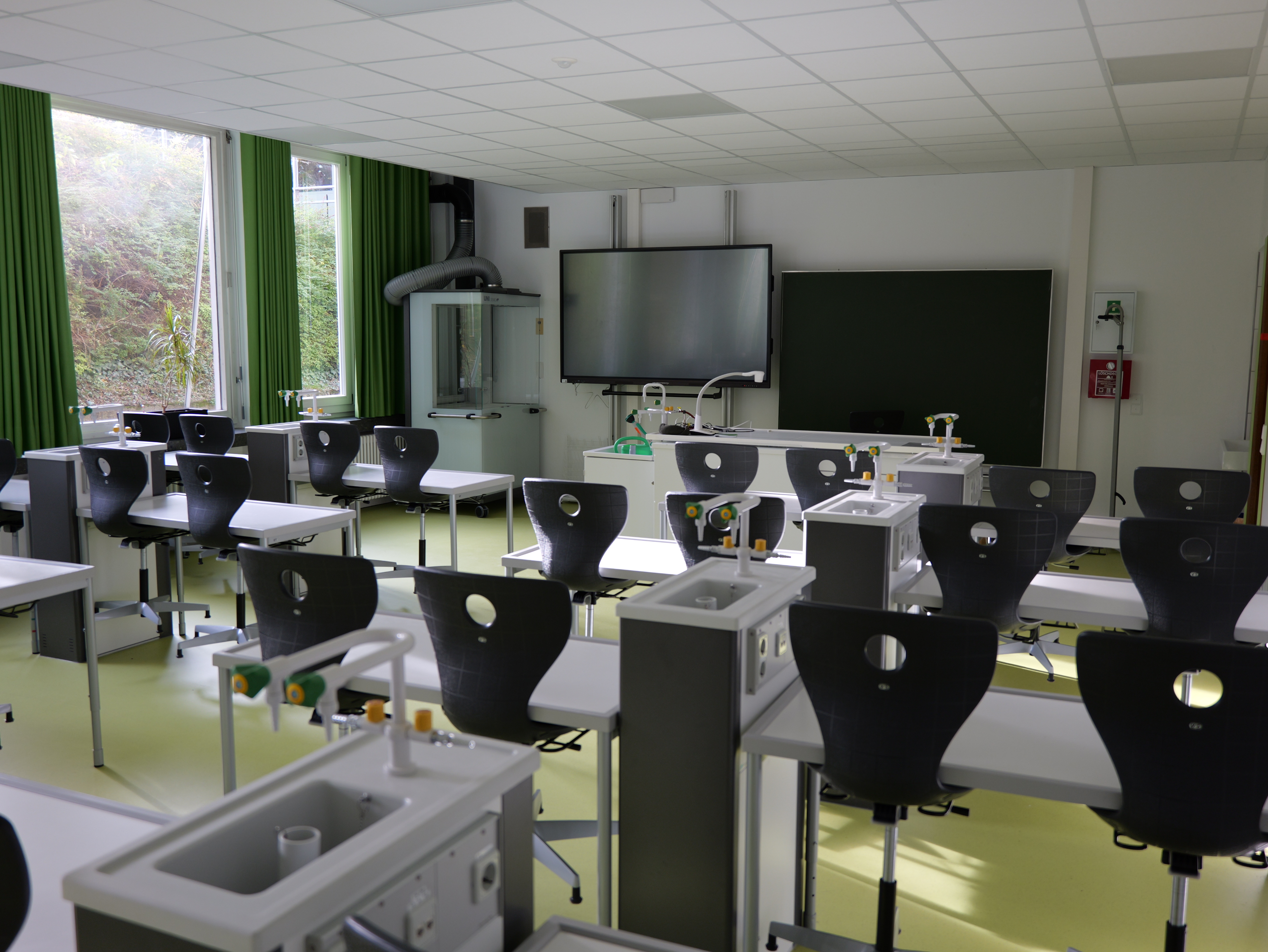 Nach den erfolgreichen Sanierungen der Chemie- und Physiksäle wurden nun auch die beiden in die Jahre gekommenen Biologieräume modernisiert. Einer der Räume wurde zu einem vollwertigen Experimentiersaal umgebaut, ausgestattet mit modernen Laborarbeitsplätzen, sicherer Abzugstechnik und flexibel einsetzbaren Gruppentischen. Der zweite Raum wurde als Fachklassenraum saniert und behielt seine charakteristischen Vitrinen mit Präparaten und Modellen, die nun zeitgemäß erneuert wurden.