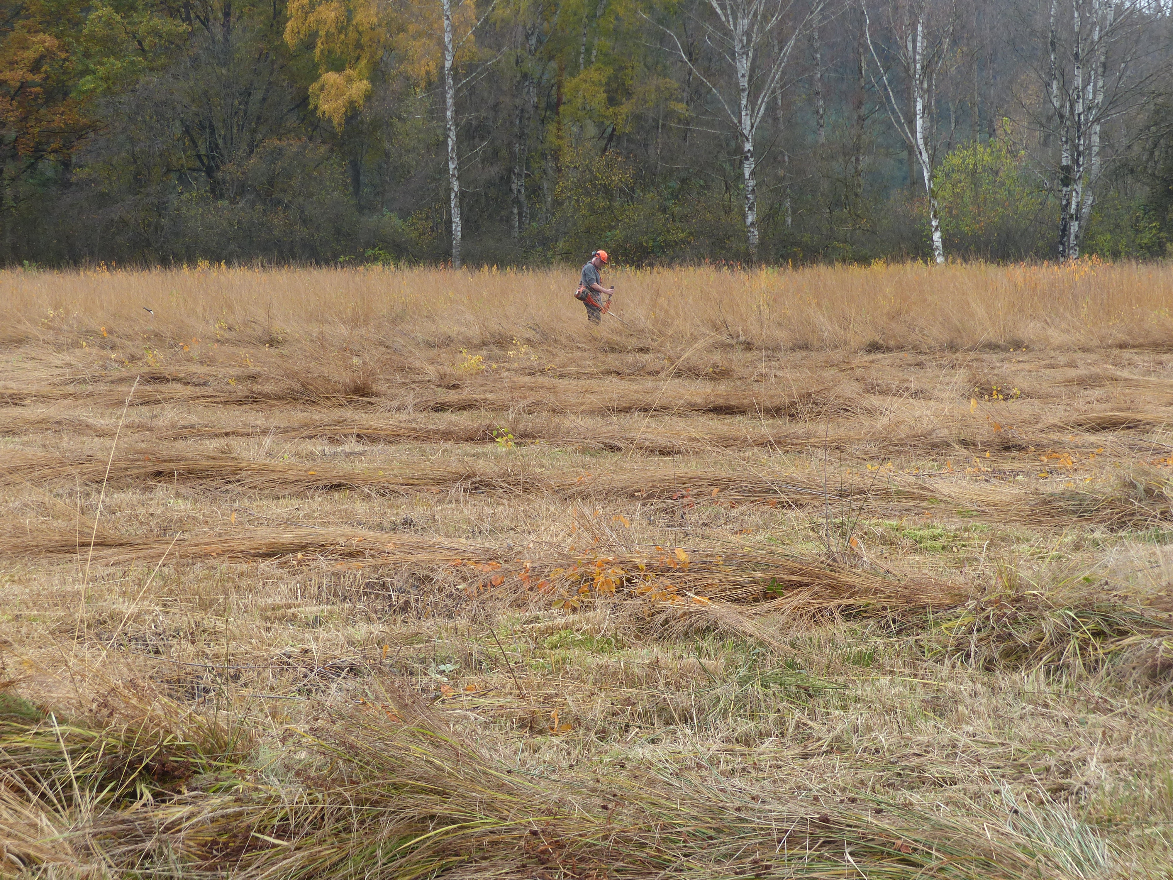 Landwirte aus der Region übernehmen im Auftrag des LPV die Mahd und räumen das Schnittgut mühsam aus dem schwer zugänglichen Gelände.