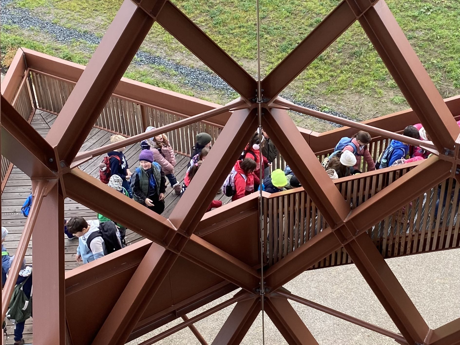 Am Fuße des Turms wartete anschließend ein wahres Bewegungs- und Sinnesparadies: der Barfußpfad, der Klettergarten und die Kugelbahnen boten allen reichlich Gelegenheit, sich auszuprobieren, zu toben und Natur auf vielfältige Weise zu erleben. Ein gesundes Pausenbrot am Rastplatz rundete den erlebnisreichen Besuch perfekt ab.